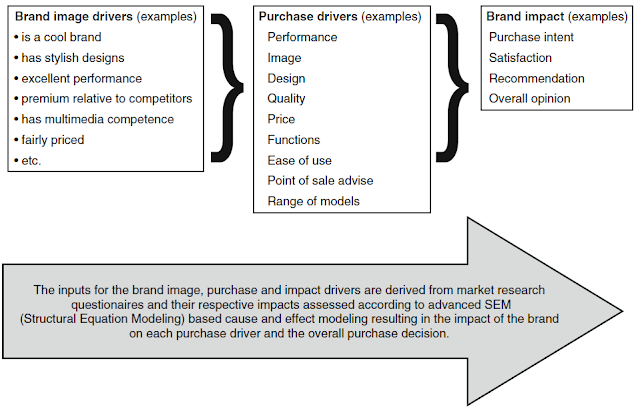 Once the key purchase drivers have been identified they need to be assessed according to their relative importance or impact on customers’ purchase decisions. This can be achieved through applying statistical modeling techniques such as structural equation modeling (SEM). Through the statistical analysis process the research results can be translated into single clearly defined purchase drivers. Once the purchase drivers and their relative importance have been assessed, the impact of the brand on the purchase drivers can be determined. From the research the brand perceptions are identified and then assessed according to their impact on the purchase drivers. It is important to analyze the impact of the brand on the purchase driver and not as a separate purchase driver, as the brand represents all perceptions of a company’s products and services. As such the brand is closely interwoven with the other tangible and intangible aspects of the offer. In the cases of functional or tangible product drivers it is the combination of brand perception and actual product delivery that drives the purchase. In